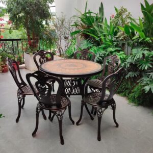 Ngày nay bàn ghế sân vườn ngoài trời là sản phẩm ngoại thất không thể thiếu trong không gian sống của mỗi gia đình, nó không chỉ đáp ứng được nhu cầu thư giãn của người sử dụng mà còn mang theo vẻ đẹp sang trọng, tao nhã. Với những chi tiết hoa văn cổ điển màu nâu đồng đã đánh bật dòng sản phẩm này một cách hài hòa tạo nên một vẻ đẹp tiền ẩn cho bộ bàn ghế sân vườn, đặc biệt là nó được thiết kế nhỏ gọn nên bạn có thể đặt ở bất kỳ vị trí nào trong khuôn viên nhà bạn.