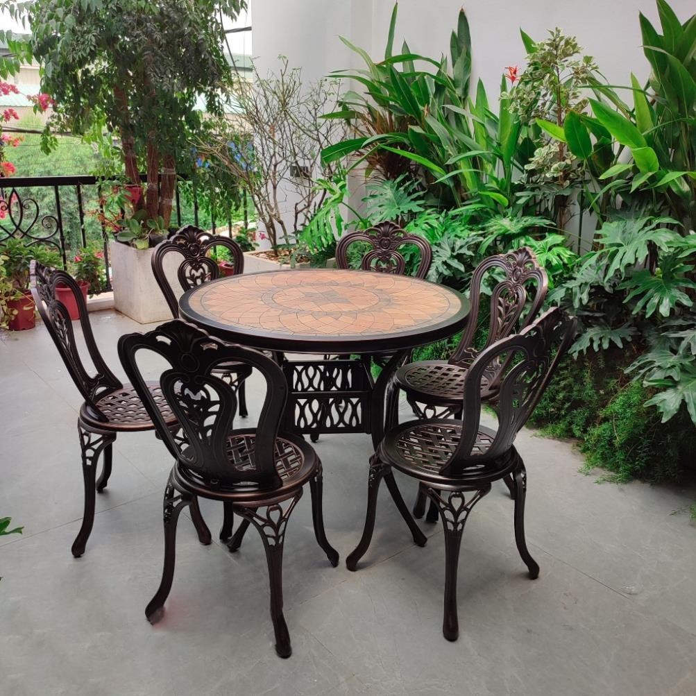 Bộ bàn ghế sân vườn này được thiết kế theo phong cách tân cổ điển, ngược lại vẻ đẹp sang trọng, lịch sự và đẳng cấp cho không gian ngoài trời. Nó bao gồm 1 bàn và 6 ghế, đủ để bạn và gia đình hay bạn bè thư giãn, họp mặt hoặc tổ chức tiệc tùng ngoài trời ăn uống và tận hưởng không gian ngoài trời thật thoải mái. , . Tuy nhiên, vì đây là sản phẩm sang trọng và cao cấp nên giá thành có thể hơi đỏ.