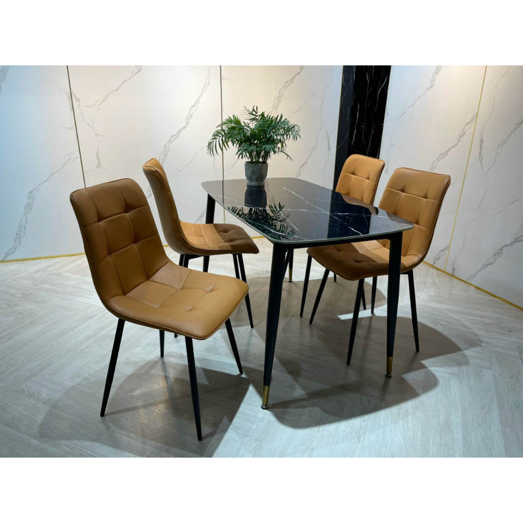 - Chất liệu: Mặt đá Ceramic, ghế bọc da
