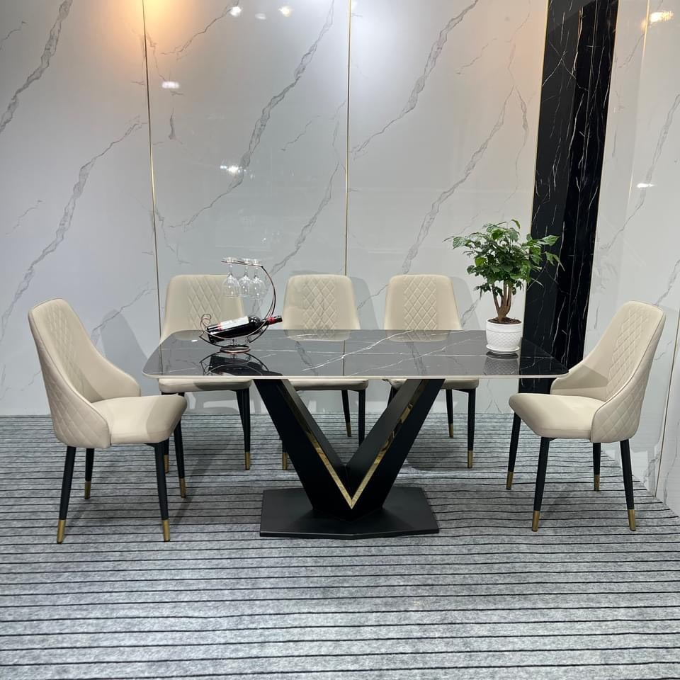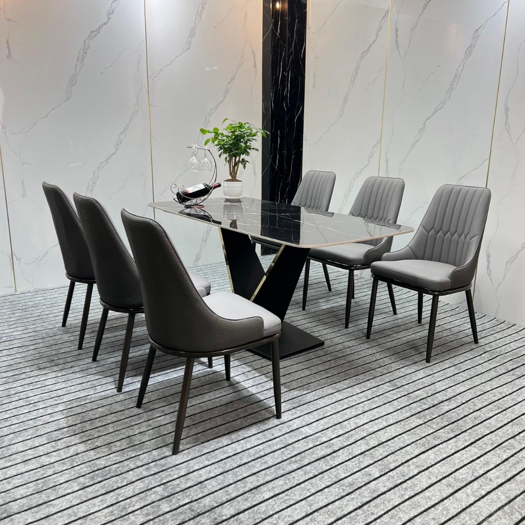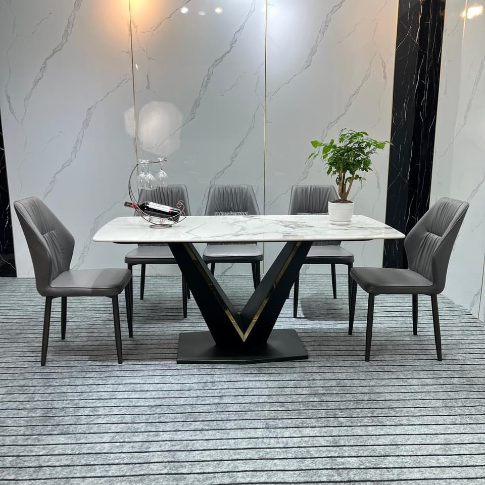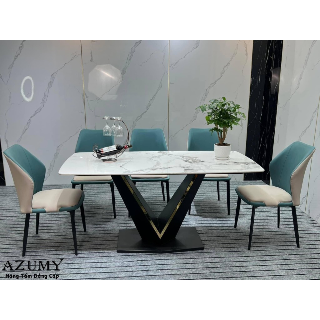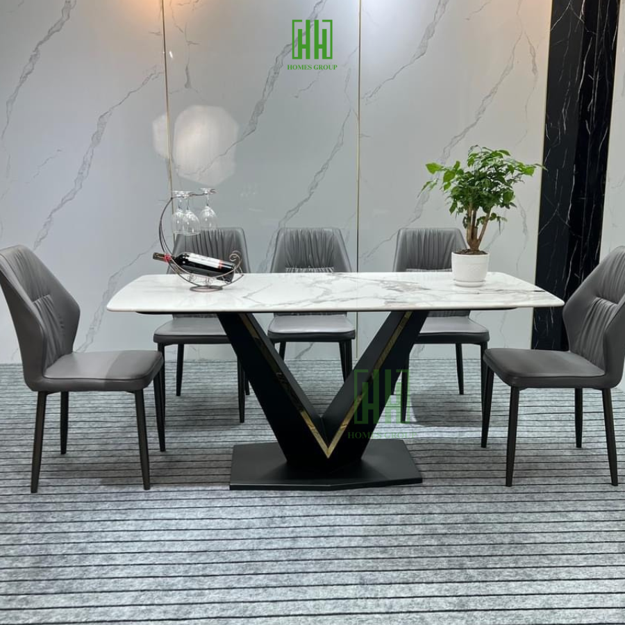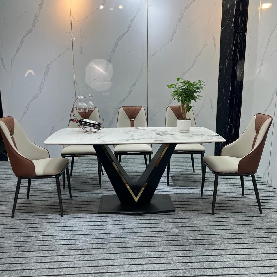 Bộ bàn ăn nhập khẩu chân V mang đến sự kết hợp hoàn hảo giữa thẩm mỹ và chất lượng. Mặt bàn được làm từ đá ceramic nhập khẩu, nổi bật với khả năng chống xước, chống ố và chống thấm nước, giữ cho bề mặt luôn mới mẻ và dễ dàng vệ sinh. Khung chân bàn được làm từ thép sơn tĩnh điện, mang lại sự chắc chắn và độ bền cao. Thiết kế chân bàn kiểu chữ V không chỉ tạo điểm nhấn về mặt thẩm mỹ mà còn giúp gia tăng sự ổn định của bàn. Bộ sản phẩm có thể đi kèm với nhiều kiểu ghế khác nhau, từ ghế bọc da PU sang trọng đến ghế bọc vải nỉ, giúp bạn tạo ra một không gian ăn uống hoàn hảo.