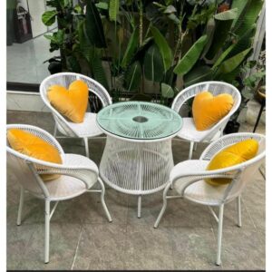 • Chất liệu: Mặt bàn bằng kính cường lực hoặc gỗ tự nhiên, chân bàn và khung ghế làm từ mây nhựa bền bỉ.