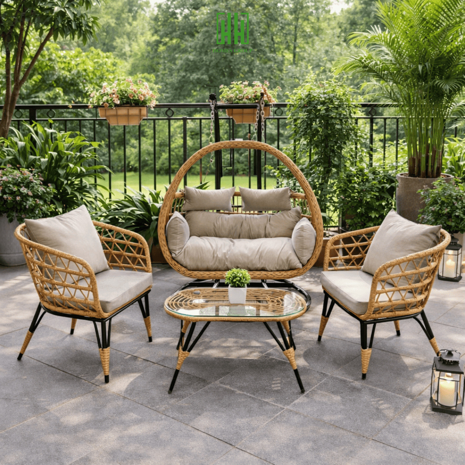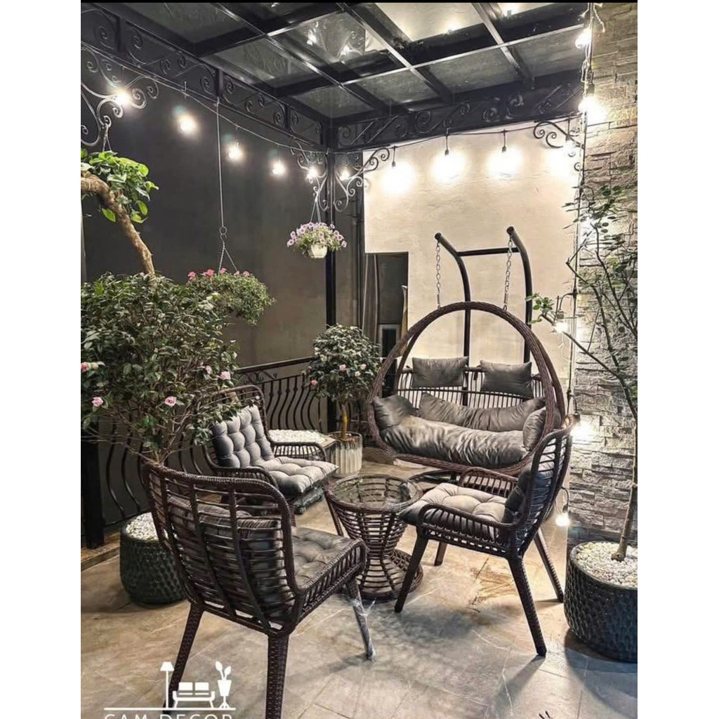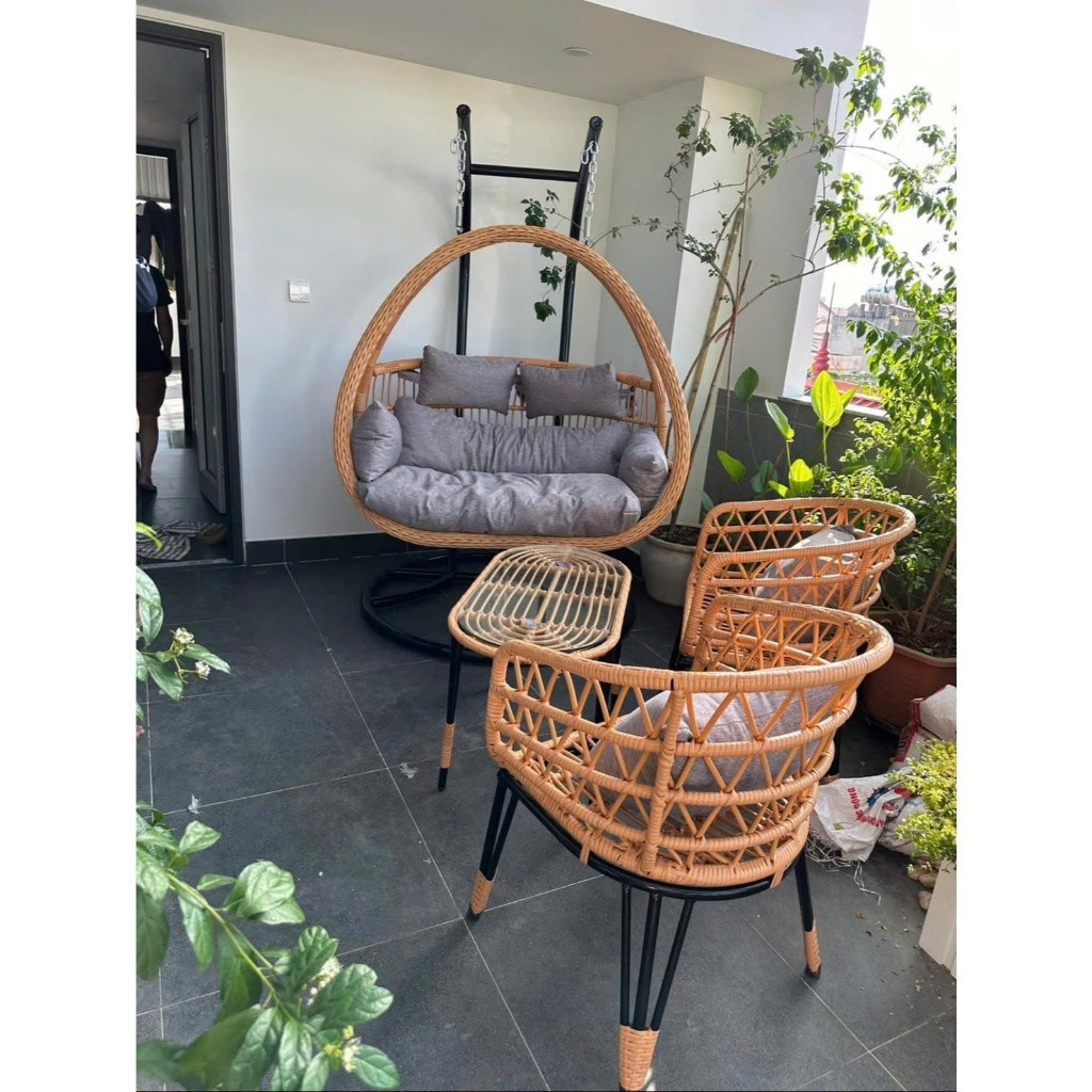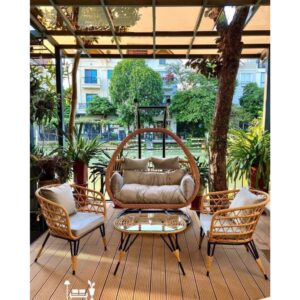 Bộ bàn ghế ban công sân vườn kèm xích đu HOMESGROUP là giải pháp nội thất ngoài trời hoàn hảo, mang đến không gian thư giãn đẳng cấp và tiện nghi.