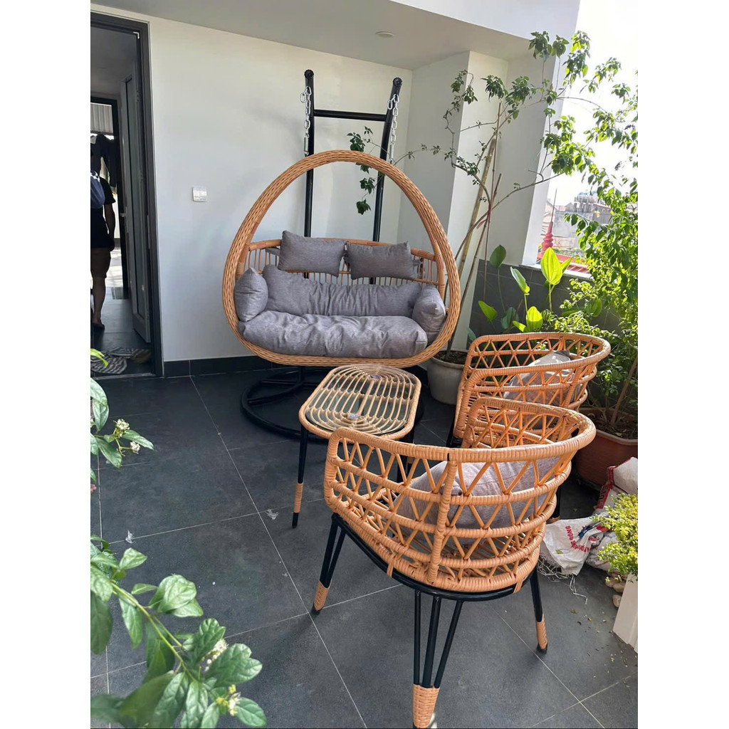 Bộ bàn ghế ban công sân vườn kèm xích đu mây nhựa khung thép sơn tĩnh điện