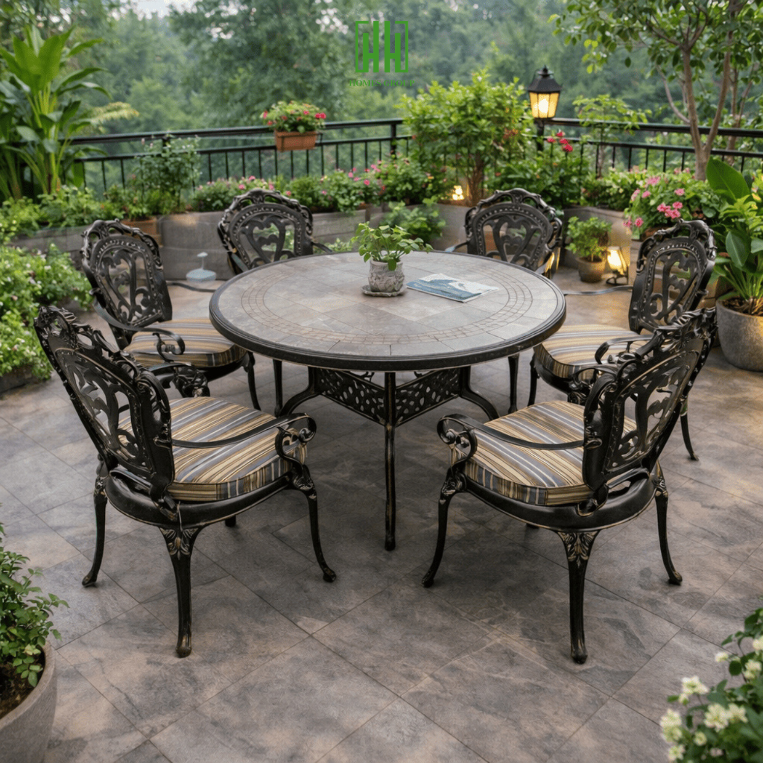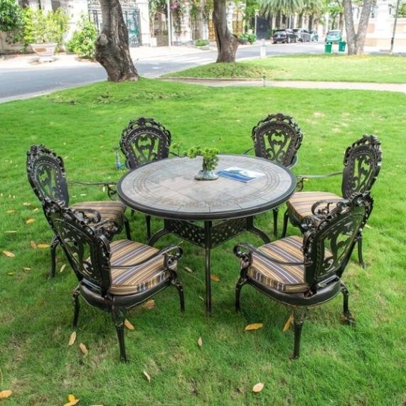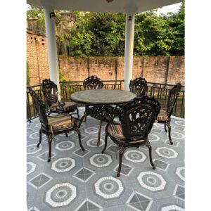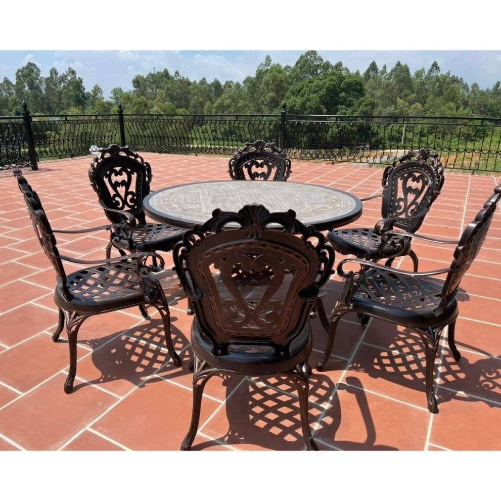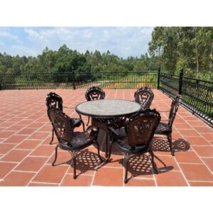 Bộ bàn ghế nhôm đúc mặt đá D120-6GTCD là dòng sản phẩm cao cấp dành cho không gian sân vườn, ban công, biệt thự, quán cafe và nhà hàng ngoài trời. Thiết kế tinh xảo với họa tiết đúc nghệ thuật sang trọng, kết hợp mặt bàn đá cao cấp tạo điểm nhấn đẳng cấp cho không gian.