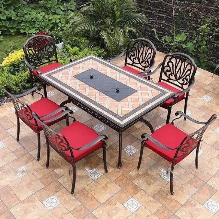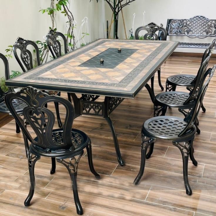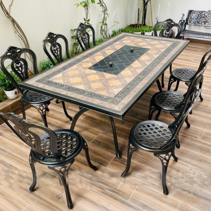 Bộ bàn ghế sân vườn ngoài trời nhôm đúc mặt đá tích hợp bếp nướng than BBQ kết với với 6 ghế đan ô to hoặc 8 ghế vương niệm nhỏ, Chất liệu của khung bàn được làm bằng hợp kim nhôm sơn tĩnh điện bao viền mặt bàn bằng đá tự nhiên mang phong cách gần gũi dễ thương nhưng không kém phần sang trọng và thanh lịch.