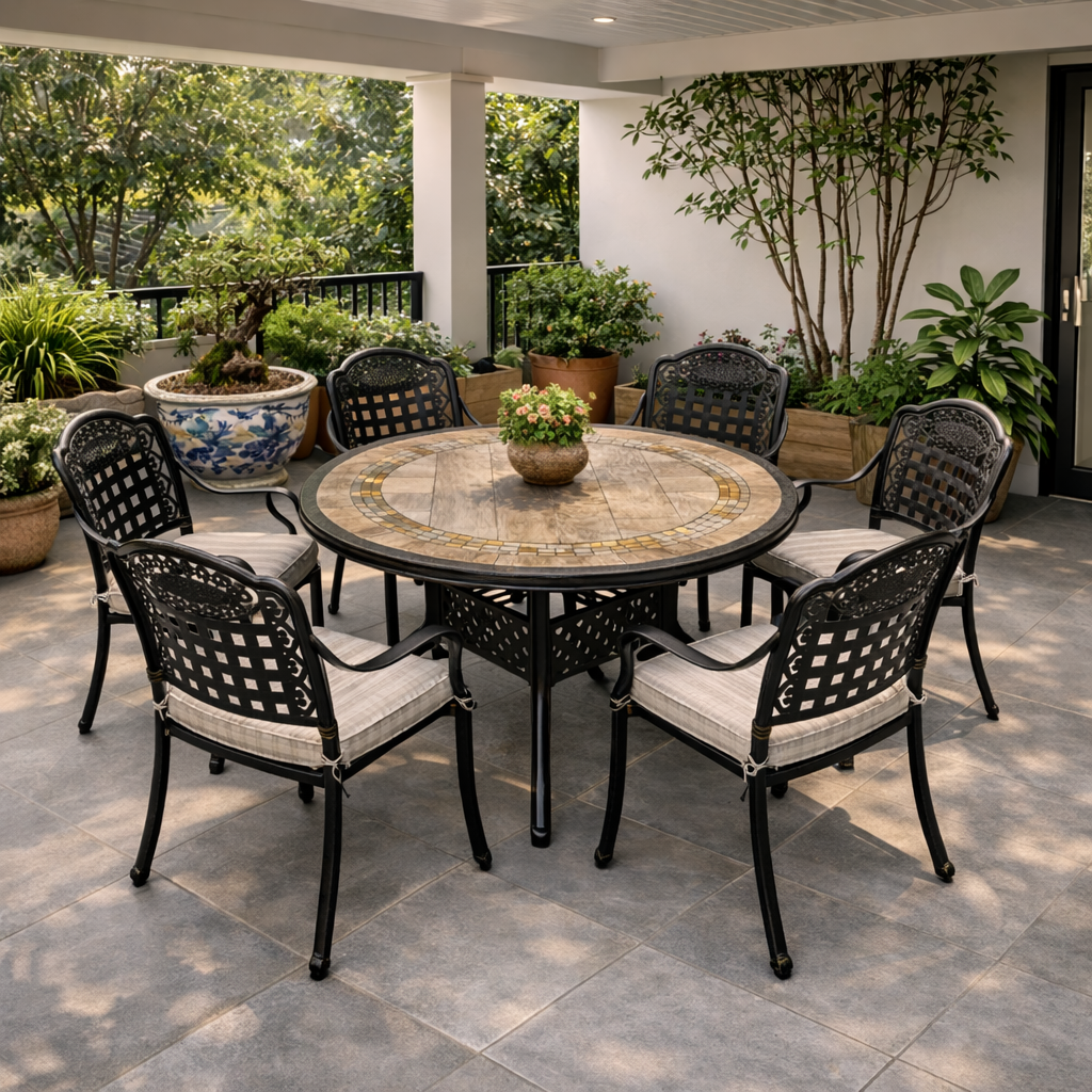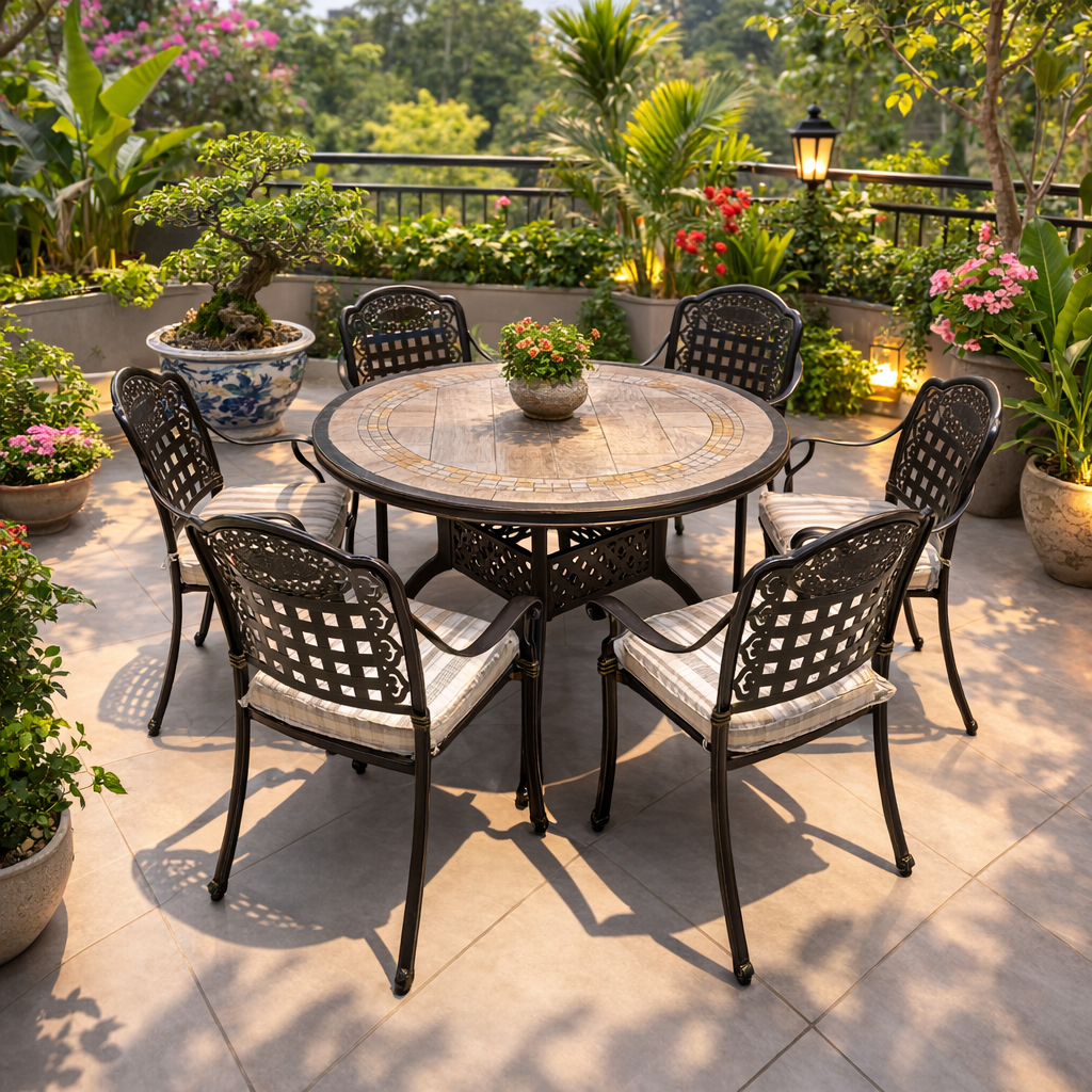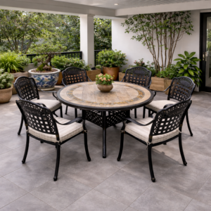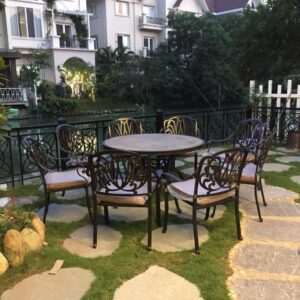 Bộ Bàn Ghế Sân Vườn Mặt Đá D120 được làm từ chất liệu nhôm đúc cao cấp, không chỉ đảm bảo tính thẩm mỹ mà còn mang lại độ bền đáng tin cậy. Với lớp sơn tĩnh điện hiện đại, bộ bàn ghế này có khả năng chống lại các tác động của môi trường như mưa, nắng, gió bụi mà vẫn giữ được màu sắc và độ bền đẹp. Sơn tĩnh điện cũng giúp bảo vệ sản phẩm khỏi tình trạng trầy xước và bong tróc, giúp duy trì vẻ ngoài mới mẻ trong suốt thời gian sử dụng.