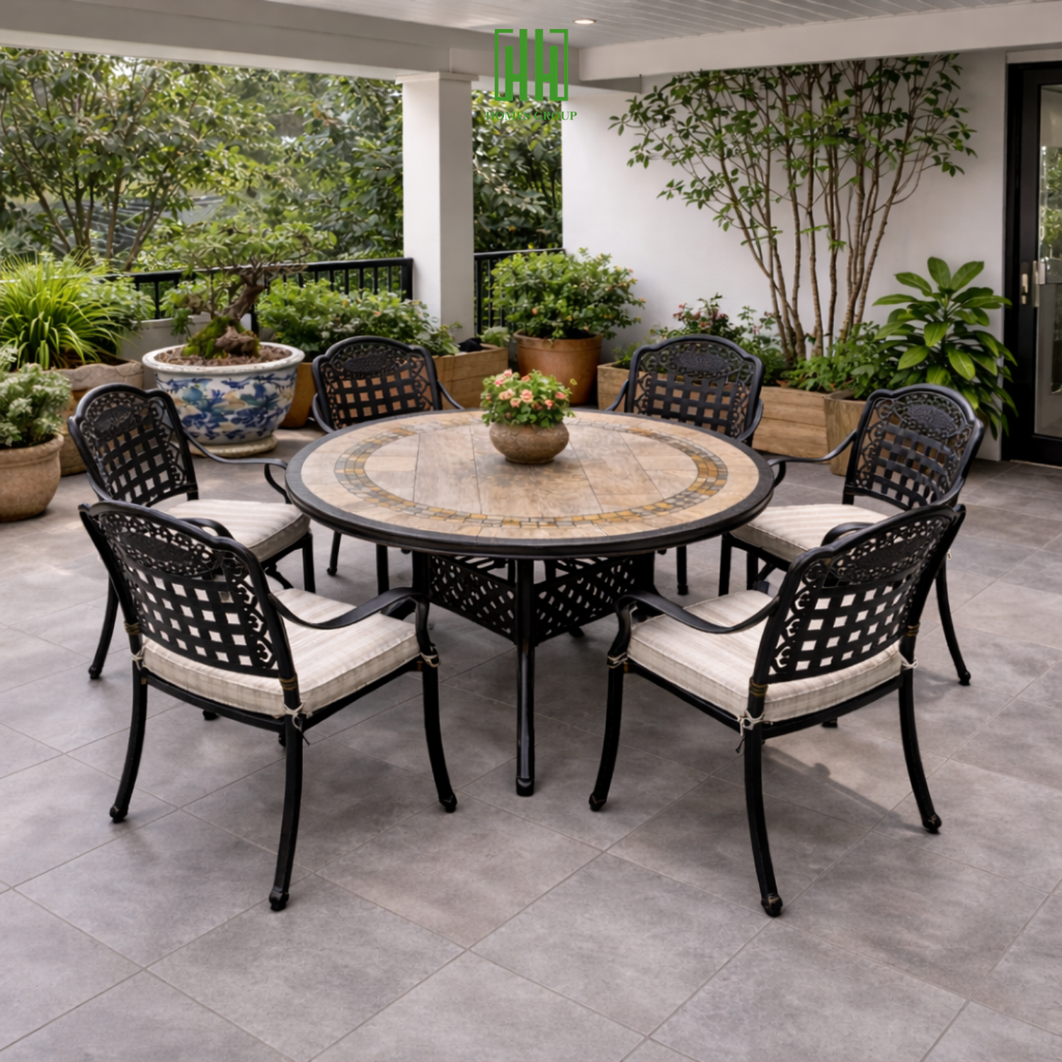Chất liệu bàn: Khung nhôm đúc sơn tĩnh điện, mặt đá gốm