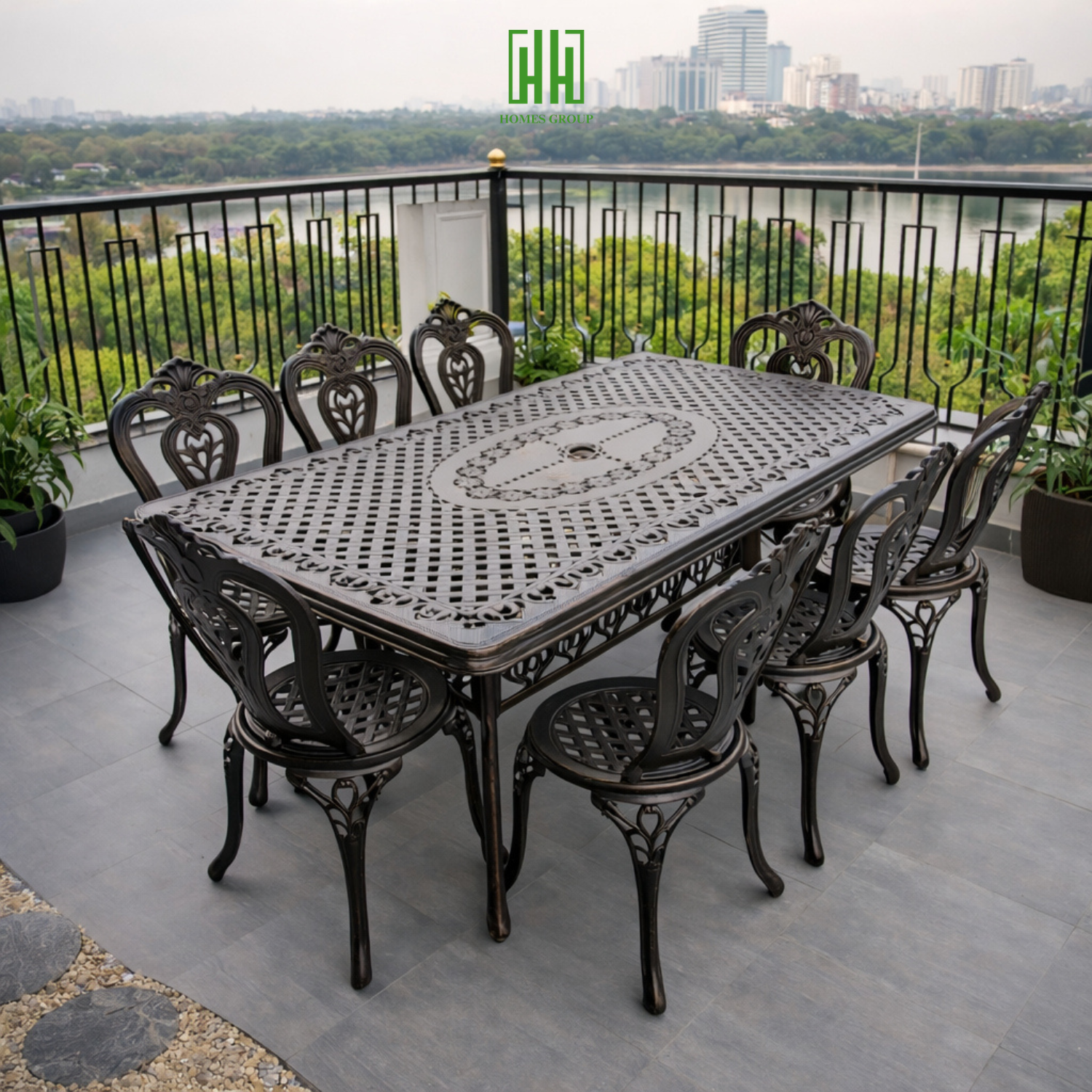 Bộ bàn ghế sân vườn nhôm đúc mã D175-8G là dòng sản phẩm cao cấp chuyên dùng cho không gian ngoài trời, mang phong cách sang trọng và độ bền vượt trội.