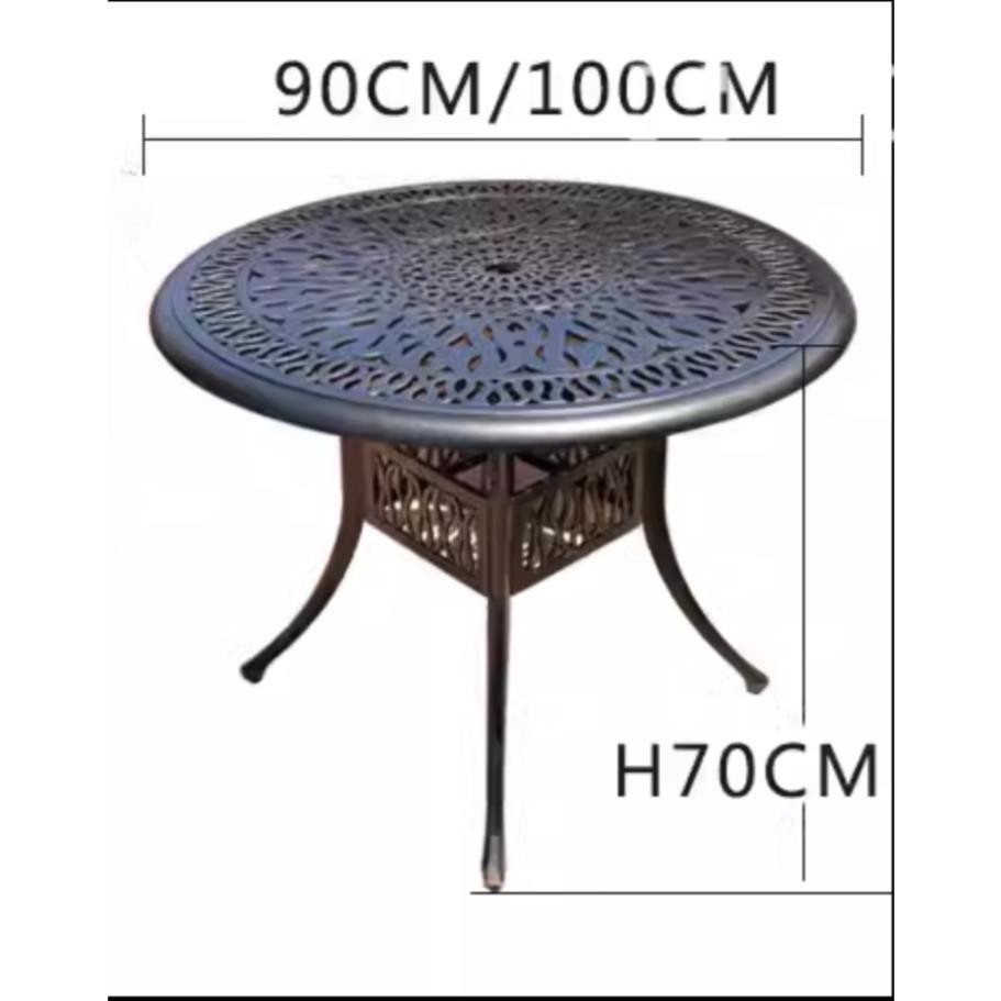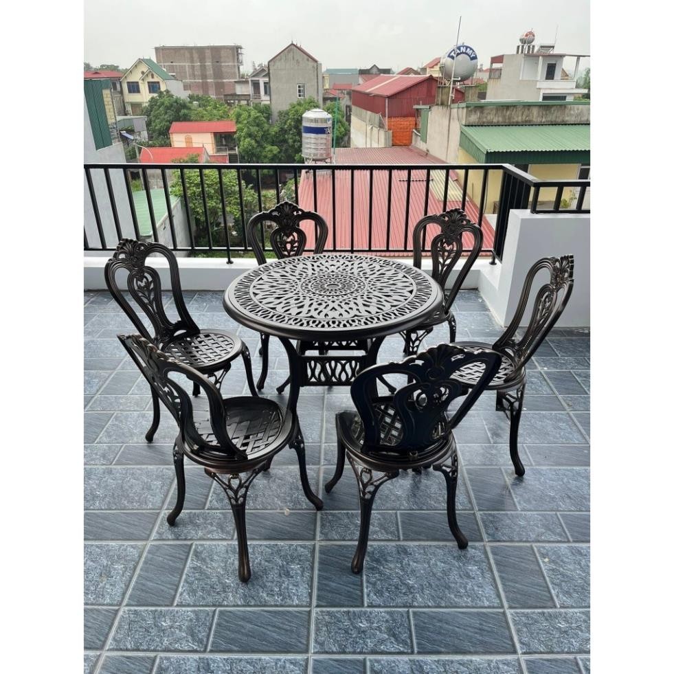 Bộ bàn ghế sân vườn nhôm đúc D90 gồm một bàn tròn có kích thước bàn D90*72cm và 6 ghế 45*52*88cm cả bàn và ghế ngồi đều được thết kế mặt lỗ và các họa tiết hoa văn rất cân xứng và mềm mại để tạo nên một vẻ đẹp duyên dáng và nét sang trọng quý phái và thanh lịch.