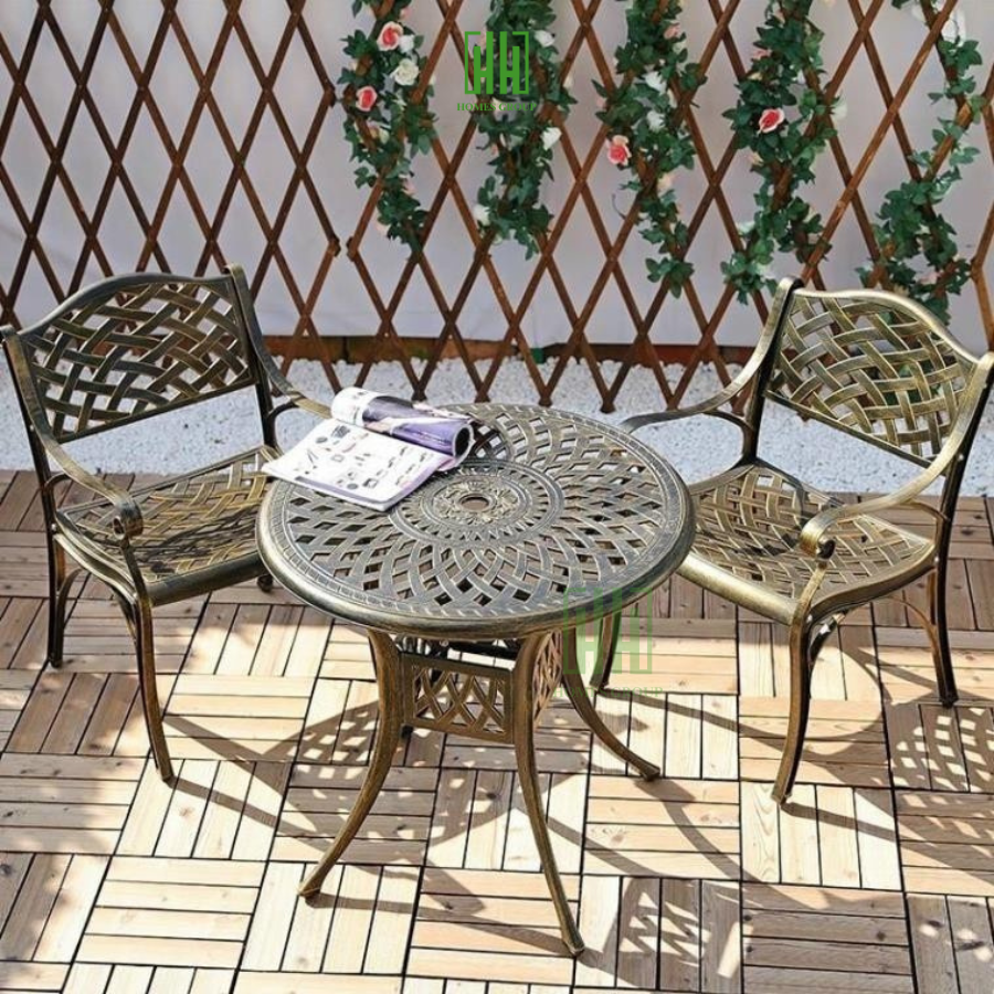 - Chất liệu: Khung bàn và ghế được làm từ hợp kim nhôm đúc, thép sơn tĩnh điện hoặc gỗ tự nhiên, kết hợp với mây nhựa hoặc vải chịu lực. Các chất liệu này đều có khả năng chống thấm nước, chống gỉ sét và chịu được tác động của thời tiết khắc nghiệt.