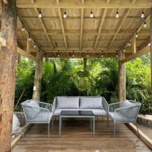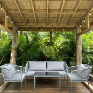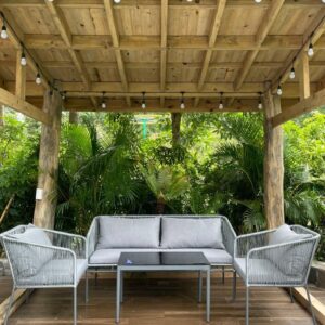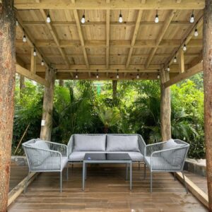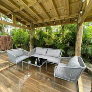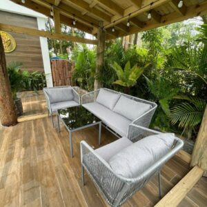 - Sử dụng đa năng: Bộ sofa có thể sử dụng cho nhiều không gian khác nhau, từ phòng khách trong nhà đến sân vườn, ban công hoặc hiên nhà ngoài trời. Chất liệu bền bỉ và thiết kế linh hoạt giúp sản phẩm phù hợp với nhiều điều kiện sử dụng và dễ dàng phối hợp với các kiểu trang trí khác nhau