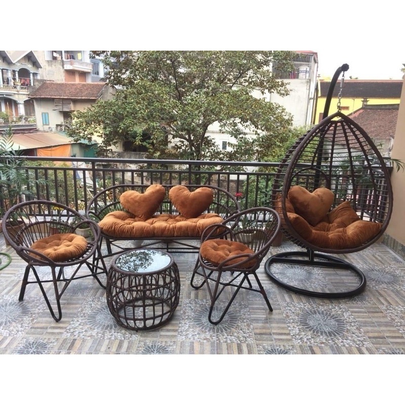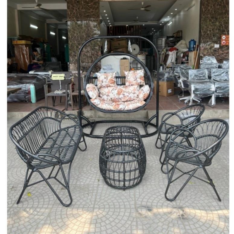 Combo bàn ghế Xích đu mây nhựa kèm nệm dùng ban công sân vườn
