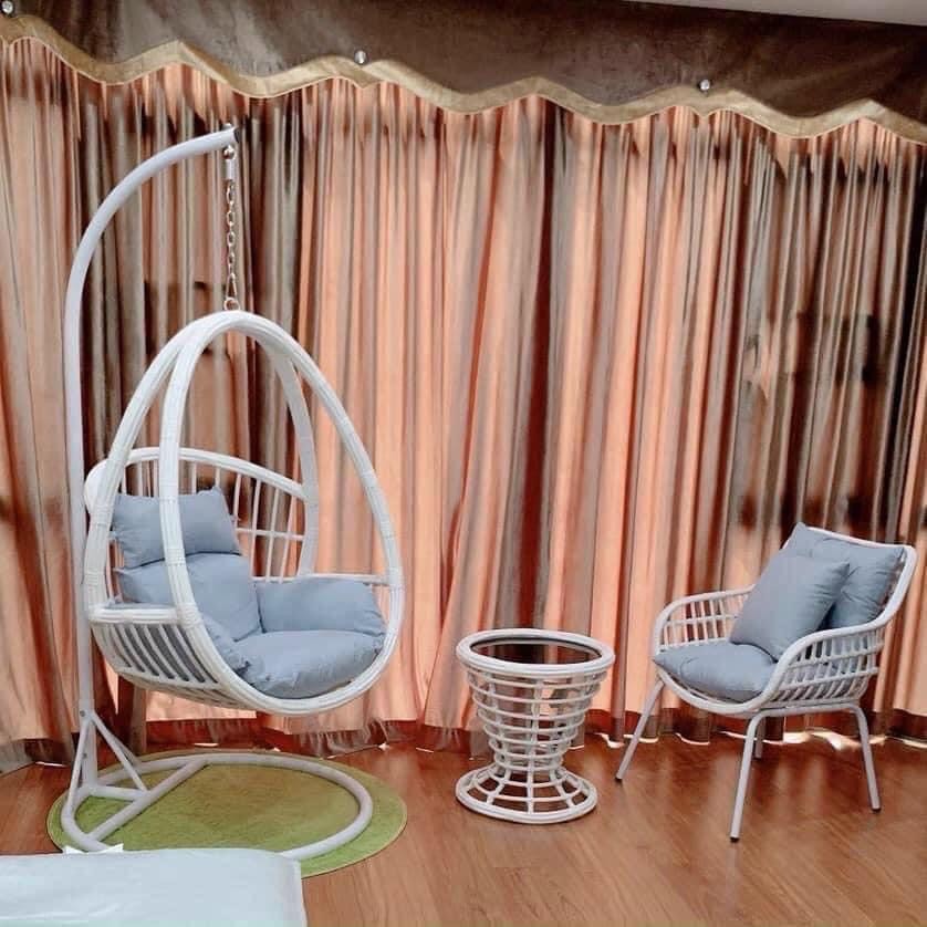 – Xích đu đơn: chất liệu mây nhựa (nhựa giả mây) – Khung sắt hình dáng giống tổ chim, giọt nước, ghế trứng hoa văn, ….
