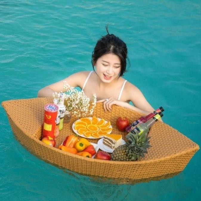 Khay nổi bể bơi dạng thuyền mây nhựa cao cấp decor bể bơi, homestay, khách sạn